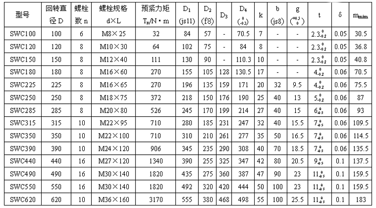 SWC型萬(wàn)向聯(lián)軸器相配件的聯(lián)接尺寸及螺栓預(yù)緊力矩(JB/T5513-91)/mm