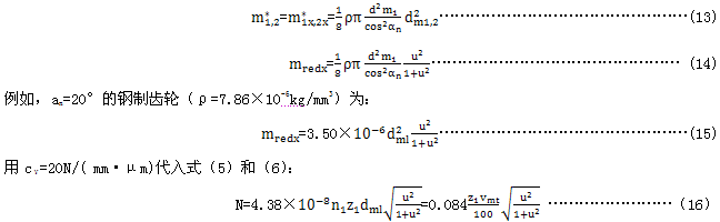 對圓柱齒輪,采用co′=14N/( mm·μm)。對圓柱斜齒輪的研究表明,螺旋 角增加時,齒的剛度降低。另一方面,錐齒輪的輪齒在錐體上的螺旋形布置加強了斜齒、弧齒錐齒輪的剛度。由于缺乏更深入的了解,在平均條件下(FmtKA/bc≥100N/mm,與bc/b≥0.85),圓柱直齒輪的剛度對錐齒輪是適用的。因此,c′能按下式確定: