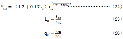 應(yīng)力修正系數(shù)Ysa是把名義彎曲應(yīng)力轉(zhuǎn)換成齒根應(yīng)力基本值的系數(shù)。它考慮了齒根過渡曲線處的應(yīng)力集中的效應(yīng),以及彎曲應(yīng)力以外的其他應(yīng)力對齒根應(yīng)力的影響(進(jìn)一步的說明見GB/T3480)。