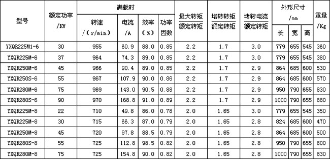 YXQR系列(IP23)低壓諧波起動(dòng)三相異步電動(dòng)機(jī)   相關(guān)參數(shù)列表
