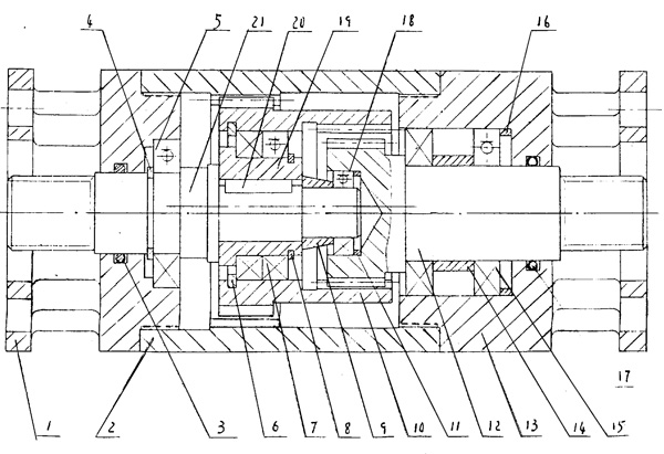 | 一種潛油減速機,由左端蓋、內齒輪、O形圈、擋圈、軸承、定距套、雙聯(lián)齒輪、調整環(huán)、齒輪軸、右端蓋、偏心套、鍵、軸組成,其特征是:左端蓋內裝O形圈,在軸上安裝軸承并用擋圈固定,將軸裝在左端蓋上,把鍵裝在軸右端,并將偏心套裝在軸上,在雙聯(lián)齒輪上安裝擋圈及軸承,并一起裝在偏心套上,用擋圈固定,定距套裝在軸的右端,內齒輪與左端蓋靠螺紋連為一體,右端蓋內裝O形圈,并安裝調整環(huán)、軸承、定距套,在齒輪軸左端裝調整環(huán)和軸承,并一起裝入右端蓋內,連同整體靠螺紋與內齒輪連為一體。左端蓋與電動機把合,右端蓋與油泵把合。 |