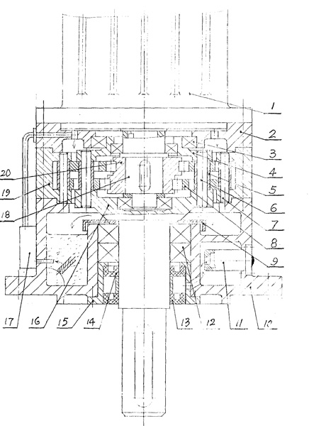 | 一種釜用不泄漏減速機(jī),由擺線輪[8]、輸入軸[18]、偏心軸承[20]、機(jī)座[10]、針齒輪及W輸出機(jī)構(gòu)組成,其中針齒輪由針齒殼[19],均布在針齒殼上的針齒[7]構(gòu)成,W機(jī)構(gòu)由輸出軸[16]與均布在輸出軸圓盤上的柱銷[6]及柱套[5]構(gòu)成,其特征在于: a)機(jī)座[10]內(nèi)有一儲(chǔ)油腔,機(jī)座外壁有一油泵[17]用來將儲(chǔ)油腔的潤滑油泵至減速機(jī)頂端由上而下對(duì)機(jī)件進(jìn)行潤滑; b)在輸出軸支承軸承[12]頂端有一圓環(huán)蓋[9],其高度高于儲(chǔ)油面1~3cm,用以防止從沿輸出軸漏油; c)在輸出軸軸承[12]下端有一個(gè)密封組件,它由套筒[15]及裝在套筒內(nèi)的密封[13]、[14]構(gòu)成,二密封之間要有一定空間,密封組件用以防止有毒介質(zhì)從反應(yīng)釜中泄漏到減速機(jī)內(nèi)腔。 |