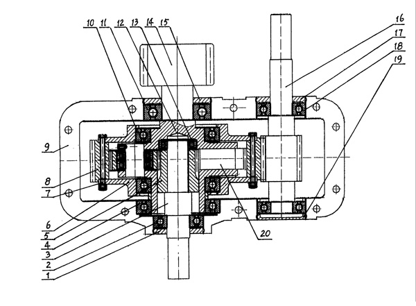 一種絞車差動減速機,由電機輸入軸、太陽輪軸、太陽輪、齒圈、行星輪、行星架、行星端蓋、外齒輪、箱體、軸承和油封組成,其特征在于:在箱體(9)上通過軸承(18)安裝電機輸入軸(16),通過軸承(2)安裝太陽輪軸(3),通過軸承(4)(11)安裝行星架(12),在行星架(12)上通過軸承(13)安裝太陽輪軸(3),通過軸承(10)安裝行星端蓋(6),齒圈(8)通過螺栓(7)安裝在行星端蓋(6)上,電機輸入軸(16)上的齒輪與齒圈(8)嚙合,行星輪(20)與齒圈(8)的內(nèi)齒輪和太陽輪(5)嚙合,行星輪(20)與行星架(12)相連。