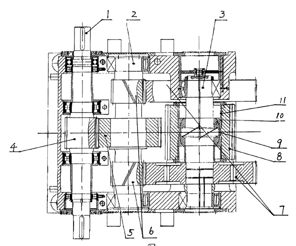 | 本實(shí)用新型提供了一種水泥磨機(jī)用單邊雙傳動減速機(jī),主要由第一軸1、第二軸2及第三軸3組成,其特征在于:第一軸1與第三軸3之間有第二軸2,第三軸3有兩個(gè),兩個(gè)第三軸與第二軸2的軸間距相等,第一軸1上的小齒輪4與第二軸2上的大齒輪5為直齒嚙合,第二軸2上的小齒輪6同時(shí)與兩個(gè)第三軸3上的大齒輪7斜齒嚙合,并且同一軸上的兩個(gè)小齒輪6或大齒輪7螺旋方向相反,螺旋角相等,第三軸3的中部設(shè)置有圓柱齒輪8。本實(shí)用新型結(jié)構(gòu)簡單、緊湊,體積小,并且動力傳遞的均載同步性好。 |
