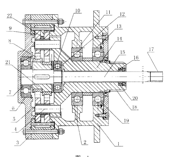 | 一種擺線針輪減速機(jī),包括殼體(1)、端蓋(3)、輸出軸(14)、輸出軸軸承(2,19)、輸入軸(15)及輸入軸軸承(7,10,16),其特征在于:輸入軸軸承(7,10,16)分別固定在端蓋軸承室(6)及輸出軸軸承室(12,20)內(nèi),輸出軸軸承(2,19)分別固定在殼體(1)內(nèi)的軸承室(11,13)內(nèi),輸入軸(15)上固定有偏心套(21),偏心套(21)上固定兩個(gè)偏心軸承(8),兩個(gè)偏心軸承(8)上分別固定中間有間隔環(huán)(22)的擺線輪(9),擺線輪(9)上的孔內(nèi)置有銷套(5),銷套(5)內(nèi)置有一端置入輸出軸(14)上的孔內(nèi)的銷軸(4)。 |
