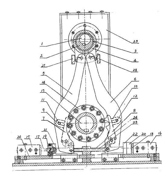 | 一種換向減速機包括殼體,換向裝置,主動輪,被動輪,輸出軸,輸入軸,其特征在上述所述的輸入軸(1)上固定偏心輪(2),偏心輪(2)外圓上有偏心軸承(3),偏心輪軸承(3)外圓上有拉板套(4),拉板套(4)上分別鉸連左拉板(5)、右拉板(6);左拉板(5)上鉸連左拉鉤(7),左拉鉤(7)上固定左拉鉤導(dǎo)塊(9);用左拉鉤導(dǎo)塊銷(11)與左拉板(5)鉸連;在右拉板(6)上鉸連右拉鉤(8),右拉鉤(8)上固定右拉鉤導(dǎo)塊(10)用右拉鉤導(dǎo)塊銷(12)與右拉板(6)鉸連,在輸出軸(13)上固定套筒滾子輪(14),在底板(26)上固定左程控液力缸(15)、右程控液力缸(16),左拉板導(dǎo)板(21),右拉板導(dǎo)板(22);在左程控液力缸(15)內(nèi)裝左柱塞(17),用左拉板鎖定器(19)與左拉板導(dǎo)板(21)連接,在右程控液力缸(16)內(nèi)裝有右柱塞(18),用右拉板鎖定器(20)與右拉板導(dǎo)板(22)連接,解鎖彈簧(24)套在推桿(23)上,拉板套(4)兩側(cè)設(shè)置有左限位板(27),右限位板(28)。 |