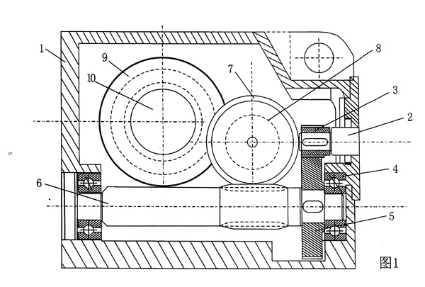 | 大速比減速機(jī),包括外殼、輸入軸、蝸輪、蝸桿、軸承與輸出軸,是單級傳動結(jié)構(gòu),其特征是在輸入軸(2)上安裝有主動齒輪(3)與被動齒輪(5)嚙合,被動齒輪(5)安裝在蝸桿(6)端部構(gòu)成一級傳動結(jié)構(gòu);蝸桿(6)與蝸輪(7)嚙合,構(gòu)成二級傳動結(jié)構(gòu);在蝸輪(7)軸上還安裝有齒輪(8)與輸出大齒輪(9)嚙合,輸出大齒輪(9)安裝在輸出軸(10)上,構(gòu)成三級傳動結(jié)構(gòu)。 |