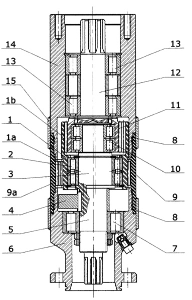 | 一種潛油泵專用減速機(jī),其主要結(jié)構(gòu)特征是雙聯(lián)行星齒輪安裝在輸入軸的偏心軸頸上,其下端的小齒輪與固定齒圈相嚙合,上端的齒圈與輸出軸上的小齒輪相嚙合,輸入軸的下端安裝在下接頭上,上端安裝在輸出軸上,輸出軸則安裝在上接頭上;由于偏心軸頸的作用,使行星齒輪在齒圈內(nèi)作既有公轉(zhuǎn)又有自轉(zhuǎn)的行星運(yùn)動,并帶動輸出軸上的小齒輪轉(zhuǎn)動,輸出軸即可將該轉(zhuǎn)速輸出。本實用新型可使用在深度大于1000米的深井中,并能在100℃-200℃的高溫下及10兆帕以上的高壓下穩(wěn)定運(yùn)轉(zhuǎn),其超載能力及耐熱、抗磨損性能均極強(qiáng),結(jié)構(gòu)簡單緊湊,生產(chǎn)成本較低。 |