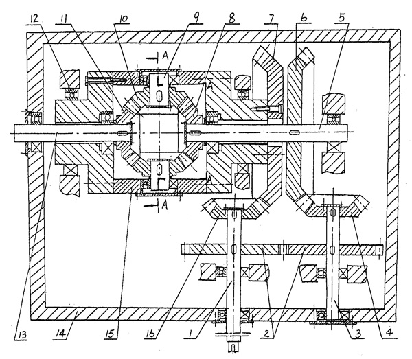 | 一種差動齒輪減速機,具有大箱體(14)和軸承(12),以及支承在大箱體(14)上的輸入軸(1)和輸出軸(13),其特征在于: a、輸入軸(1)上固定連接有第一主動齒輪(16)和傳動齒輪(2); b、大箱體(14)內還支承有中間傳動軸(3),該中間傳動軸(3)上固定連接有第二主動齒輪(4)以及與輸入軸(1)上的傳動齒輪(2)相嚙合的傳動齒輪(2); c、大箱體(14)內還支承有速比差動齒輪軸(5),該速比差動齒輪軸(5)上固定連接有與第二主動齒輪(4)相嚙合的速比差動齒輪(6); d、大箱體(14)內還具有可旋轉地支承在軸承(12)上的小箱體(15),小箱體(15)的一側固定連接有與第一主動齒輪(16)嚙合的速比定齒輪(7),并支承有速比差動齒輪軸(5),另一側支承有輸出軸(13),在小箱體(15)內,速比差動齒輪軸(5)的軸端裝連有速比差動齒輪軸齒輪(8),輸出軸(13)的軸端裝連有輸出齒輪(11); e、小箱體(15)內還支承有二根或四根差動齒輪軸(9),每根差動齒輪軸(9)上都裝連有一只差動齒輪(10),差動齒輪(10)既與速比差動齒輪軸齒輪(8)嚙合,又與輸出齒輪(11)嚙合; f、速比定齒輪(7)有Z1個齒,速比差動齒輪(6)有Z2個齒,Z1和Z2相差1齒或數齒,第一主動齒輪(16)有Z3個齒,第二主動齒輪(4)有Z4個齒,Z3和Z4之比為1∶2。 |
