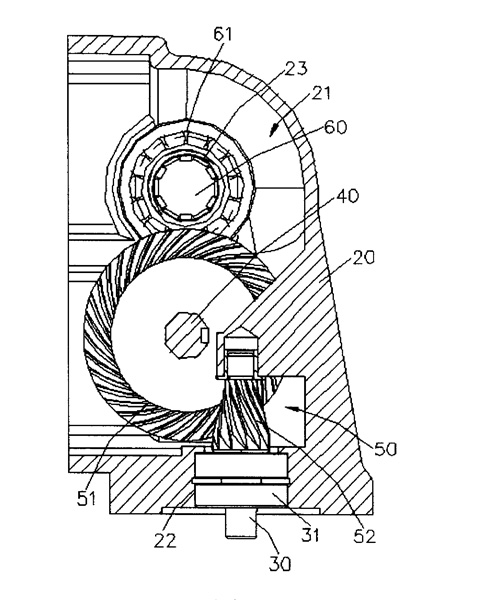 | 一種減速機(jī)結(jié)構(gòu),其特征在于,包括一本體、一動(dòng)力軸、一帶動(dòng)軸、一傘型齒輪組及一傳動(dòng)軸, 所述動(dòng)力軸,一端與預(yù)設(shè)動(dòng)力源相接,動(dòng)力軸另一端樞穿于所述本體內(nèi);該帶動(dòng)軸,系樞架于該本體內(nèi),另于帶動(dòng)軸上裝設(shè)有一小齒輪; 所述傘型齒輪組,包括一傘型齒盤(pán)及一傘型齒輪,且傘型齒輪組也位于該本體內(nèi),該傘型齒盤(pán)同軸固設(shè)于該帶動(dòng)軸,而該傘型齒輪則同軸固設(shè)于動(dòng)力軸端部,由傘型齒輪偏位嚙合于該傘型齒盤(pán),使傘型齒輪的旋轉(zhuǎn)力量直接帶動(dòng)該傘型齒盤(pán)旋轉(zhuǎn); 所述傳動(dòng)軸,一端與預(yù)設(shè)被帶動(dòng)件相接,且傳動(dòng)軸另一端樞穿于該本體內(nèi)。 |