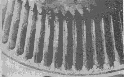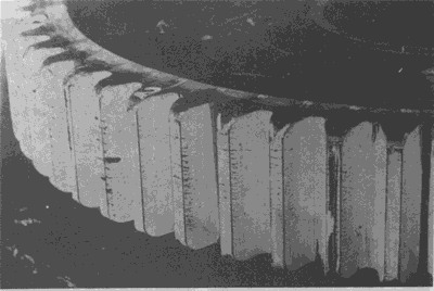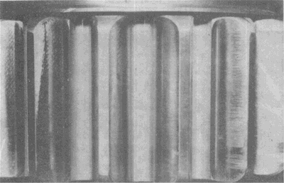 輪齒的滾壓塑變。圖為一從動(dòng)齒輪,其齒面上工作節(jié)曲面附近明顯的隆起清晰可見(jiàn)。
