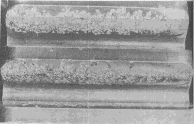 小齒輪正反齒面由于磨料磨損齒頂被磨尖。輪齒的有效齒面是光滑的,但由于相嚙齒輪的齒面上嵌入堅(jiān)硬微粒使齒面也出現(xiàn)徑向劃痕。