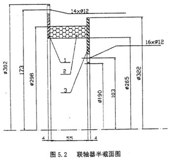 根據實際情況觀察可知橡膠塊左右分別有兩塊鋼板,析能上能下均有一些圓孔,通過實際測量得到聯(lián)軸器的基本尺寸和形狀。由于聯(lián)軸器為軸對稱圖形,故只畫出其截面圖(圖5.2)。