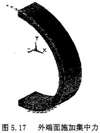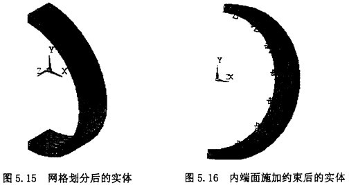 首先,在圓環(huán)內端面上施固定約束,選擇Main Menu>Solution>Define Loads>Apply>Structural>Displaedment>On Areas命令,選擇圓環(huán)內端面。施加約束后,效果如圖5.16所示。