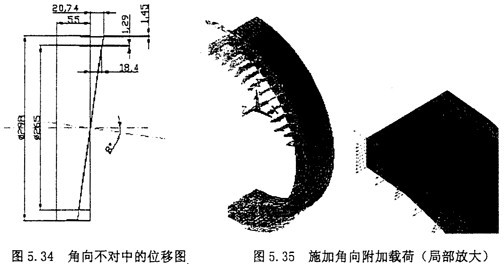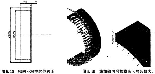 軸向不對中時,根據實際情況取中量為△ax=5mm,則可以認為外端面沿z軸方向的位移為5mm,如圖5.18所示。產生的附加的軸向載荷按照。選擇選擇Main Menu>>Solution>Define Loads>Apply>Structural>Force>Moment>On Nodes命令,選擇圓環(huán)外端面上所有的節(jié)點,在出現(xiàn)的對話框中選擇比,并在輸入value文本框中輸入39。加載后的結果如5.19所示。旁邊為局部放大圖。