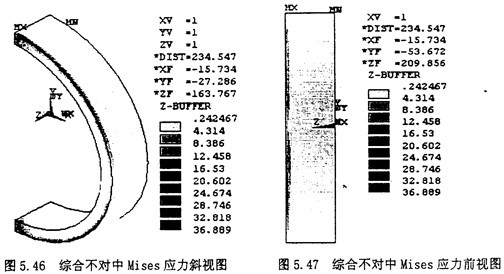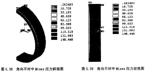 2.顯示節(jié)點的Von Mises應力云圖:選擇Main Menu>General Postproc>Plot Result>NodalSolu,在彈出的對話框內選擇“Stress”,第二欄內選擇“Von Mises Stress”,則其顯示的云圖如圖5,38,5.39所示