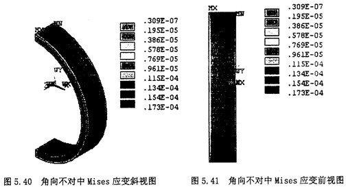 3.顯示節(jié)點的Von Mises就變云圖:選擇Main Menu>General Postproc>Plot Result>NodalSolu,在彈出的對話框內選擇“Strain”,第二欄內選擇“Von Mises Strain”,則其顯示的云圖如圖5.40,5.41所示