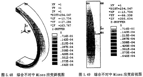 3.顯示節(jié)點的Von Mises應變云圖:選擇Main Menu>General Postproc>Plot Result>NodalSolu,在彈出的對話框內選擇“Strain”,第二欄內選擇“Von Mises Strain”,則其顯示的云圖如圖5.48,5.49所示