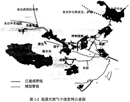 我國(guó)十至十五年內(nèi)天然氣管網(wǎng)建設(shè)的總體規(guī)劃可以概括為“兩橫兩縱”:“兩橫”分別指立足于國(guó)內(nèi)資源的輪南~上海西氣東輸干線,以及為從西部其他國(guó)家引進(jìn)天然氣建設(shè)的第二條新疆~上海輸氣干線:“兩縱”是指從俄羅斯進(jìn)口天然氣,分別建設(shè)東西伯利亞經(jīng)東北至北京,以及薩哈林至沈陽輸氣干線,具體線路走向如圖1-2所示。