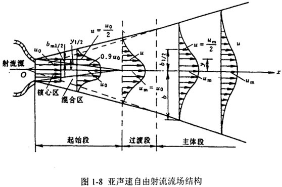 亞聲速自由射流在形成穩(wěn)定的流動(dòng)形態(tài)后,整個(gè)射流可劃分為幾個(gè)區(qū)段:由噴口邊界起向內(nèi)外擴(kuò)展的紊動(dòng)摻混部分為紊動(dòng)剪切層混合區(qū);中心部分未受摻混影響,保持原來出口流速,稱為核心區(qū),出口至核心區(qū)末端的一段稱為射流的起始段。紊動(dòng)充分發(fā)展以后的部分稱為射流的主體段。主體段與起始段之間的區(qū)域稱為過渡段。