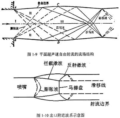對(duì)于圖1-9所示的欠膨脹超聲速自由射流,當(dāng)射擊流從出口射入靜止大氣中的時(shí)候,由于出口截面上的射流的靜壓p1大于環(huán)境壓力pa,在裂尖的邊緣將發(fā)出兩族膨脹波,這兩族膨脹波在中心流線相交,氣體經(jīng)過膨脹波使靜壓由p1降到pa,經(jīng)膨脹波后氣流,其自由邊界向外擴(kuò)張。兩族膨脹波相交之后互相穿過,并保持為膨脹波。這些膨脹波在自由邊界反射回來形成兩族壓縮波,并使氣流邊界向內(nèi)收縮。這兩族壓縮波相互穿過并在自由邊界上反射回膨脹波,這種波的相互與反射現(xiàn)象不斷地進(jìn)行下去,逐漸衰減。