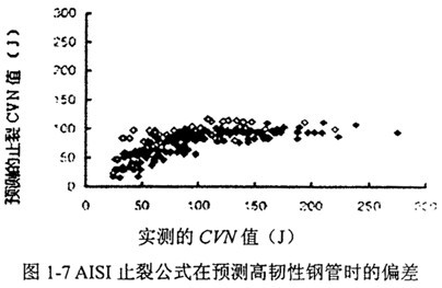 Bartell。兩步分析基于裂紋擴(kuò)展的減壓波速判據(jù),提出了行之有效的數(shù)學(xué)解法,實(shí)現(xiàn)了直接由管道工作參數(shù)推斷出止裂所需的臨界CVN沖擊韌性。后來又總結(jié)了一系列簡(jiǎn)便的經(jīng)驗(yàn)公式。在當(dāng)時(shí)的條件下,全尺寸爆破實(shí)驗(yàn)中所用的管線鋼CVN沖擊韌性一般不超過100J,CVN沖擊韌性足以描述不同鋼種的抗斷裂性能,雙曲線模型和經(jīng)驗(yàn)?zāi)J蕉寂c全尺寸爆破實(shí)驗(yàn)的結(jié)果吻合得很好。