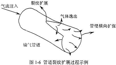 本文研究的重點(diǎn)將集中于如圖1-6的貯氣輸氣管線縱向裂紋擴(kuò)展問題。針對(duì)這一問題,20世紀(jì)80年代末美國(guó)西南研究院(Southwest Research Institute,Texas)的M.F.Kanninen,O'Donoghue等人提出了輸氣管道縱向裂紋擴(kuò)展問題的計(jì)算模型,將裂紋擴(kuò)展的斷裂動(dòng)力學(xué)算法同殼體有限元組合起來,發(fā)展了模擬計(jì)算程序PFRAC(Pipeline FRacture Analysis Code)。莊茁改進(jìn)了其部分功能并擴(kuò)展了組合受力分析的能力,發(fā)展了開裂結(jié)鉤與流體的解耦分析計(jì)算,并完成了解耦部分的計(jì)算程序。通過與實(shí)驗(yàn)比較,該程序的可靠性得到了證實(shí)。