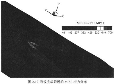 首先觀察裂尖附近的MISES應(yīng)力分布,如圖2-10。按以針狀鐵素體和塊狀鐵素體組織為主的X70鋼級(jí)管線鋼的平均屈服強(qiáng)度500~600MPa估算,計(jì)算給出的裂尖前部塑性區(qū)長(zhǎng)度大約在3個(gè)單元長(zhǎng)度以內(nèi),即0.15m左右。