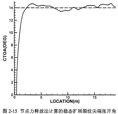 圖2-9表示了CTKOA的計(jì)算方法。由于在裂紋后方有很大的非線性變形,計(jì)算中張開(kāi)位移用割線近似,采用8個(gè)單元的長(zhǎng)度來(lái)計(jì)算CTOA。這一長(zhǎng)度經(jīng)過(guò)與細(xì)化后的網(wǎng)格結(jié)果比較,誤差在10%之內(nèi)。