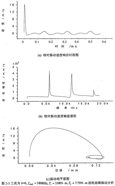 圖2-3是工況為:齒輪嚙合頻率為5888Hz、齒側(cè)間隙b=0齒輪故障振動分析,其中(a)圖為齒輪輪齒相對振動速度時(shí)程響應(yīng)圖,(b)圖為齒輪輪齒相對振動速度幅值譜圖。從圖上可看出,當(dāng)齒側(cè)間隙為0時(shí),此時(shí)振動故障頻率為齒輪嚙合頻率fmeh。的1、2、3倍。相平面圖也穩(wěn)定于一個(gè)橢園極限環(huán)(見(c)圖)。