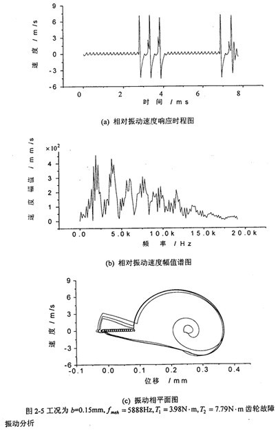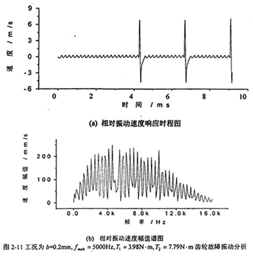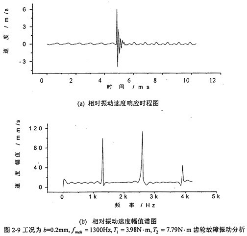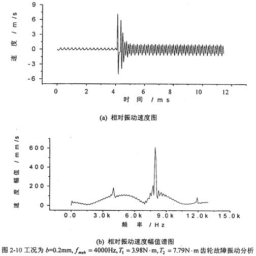 圖2-9是當(dāng)齒輪嚙合頻率為1300Hz、齒側(cè)間隙b=0.2mm時(shí),齒輪輪齒相對振動速度時(shí)程響應(yīng)圖((a)圖)和齒輪輪齒相對振動速度幅值譜圖((b)圖)。從(b)圖上可看出,當(dāng)齒側(cè)間隙為0.2mm時(shí),此時(shí)振動故障頻率為齒輪嚙合頻率fmeh的1、2、3倍,分?jǐn)?shù)諧波不明顯。