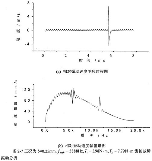 (齒厚)時(shí),齒輪輪齒相對振動速度時(shí)程響應(yīng)圖((a)圖)和齒輪輪齒相對振動速度幅值譜圖((b)圖)。從(b)圖上可看出,當(dāng)齒側(cè)間隙增加到0.25mm時(shí),此時(shí)振動故障頻率成份又發(fā)生了改變,振動故障頻率為齒輪嚙合頻率f