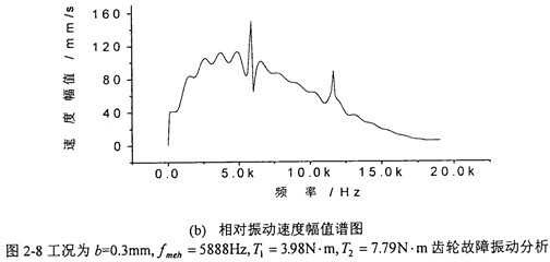 圖2-4(b)是輕載時(shí)(小的齒側(cè)間隙)齒輪輪齒相對振動速度幅值譜圖。從圖上可看出,此時(shí)振動故障頻率為齒輪嚙合頻率fmeh的1、2、3倍,無分?jǐn)?shù)諧波成份出現(xiàn)。