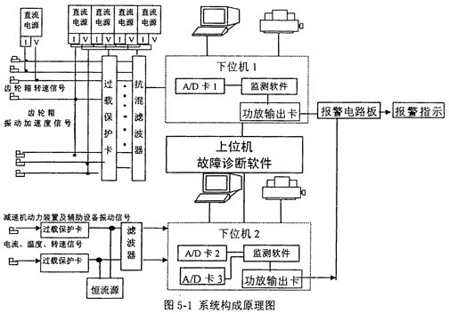 為完成對(duì)關(guān)鍵設(shè)備進(jìn)行監(jiān)測(cè)和診斷,監(jiān)測(cè)系統(tǒng)硬件的配置應(yīng)包括以下六部分:(l)傳感器、放大器;(2)信號(hào)處理儀;(3)A/D數(shù)據(jù)采集卡;(4)工業(yè)PC計(jì)算機(jī);(5)報(bào)警電路;(6)電纜、電源。