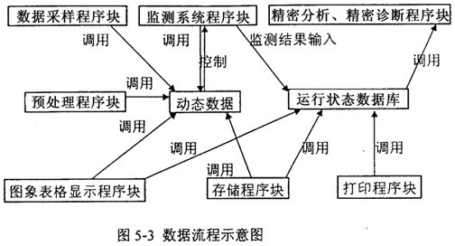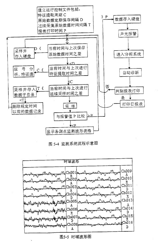 軟件的各個(gè)模塊通過動(dòng)態(tài)數(shù)據(jù)和運(yùn)行狀態(tài)數(shù)據(jù)庫聯(lián)系在一起,在下位機(jī)中,監(jiān)測(cè)系統(tǒng)控制著動(dòng)態(tài)數(shù)據(jù)的采集、存儲(chǔ)、顯示和預(yù)處理,同時(shí)把監(jiān)測(cè)結(jié)果存入各機(jī)組運(yùn)行狀態(tài)特征數(shù)據(jù)庫。在上位機(jī)中,詳細(xì)分析診斷程序塊調(diào)用運(yùn)行狀態(tài)數(shù)據(jù)庫,得出診斷結(jié)果并調(diào)用打印程序塊輸出。圖5-3為數(shù)據(jù)流程示意圖,圖5-4為監(jiān)測(cè)系統(tǒng)流程示意圖。