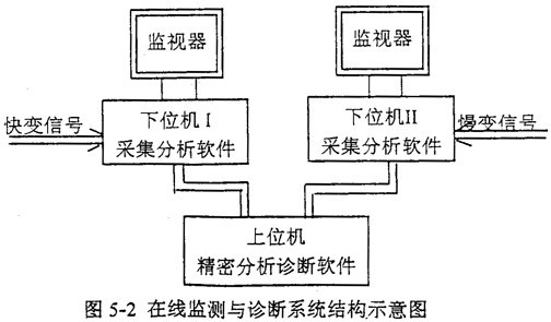 為了適應(yīng)日益更新的生產(chǎn)實(shí)際多種類型參數(shù)監(jiān)測(cè)和故障診斷的要求,建立由多臺(tái)微機(jī)并行運(yùn)行構(gòu)成的在線連續(xù)實(shí)時(shí)監(jiān)測(cè)與快速診斷系統(tǒng)。圖5-2為多微機(jī)在線監(jiān)測(cè)與診斷系統(tǒng)結(jié)構(gòu)示意圖。這樣做的優(yōu)點(diǎn)是: