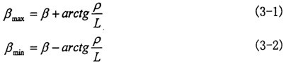 由于在轉(zhuǎn)動的過程中,三叉桿交點作旋轉(zhuǎn)運動,因此會導(dǎo)致輸入軸與輸出軸之間的夾角發(fā)生變化,其變化范圍為βmin~βmax,當(dāng)O點(見圖3-5)處于輸入軸與輸出軸轉(zhuǎn)動錐中心線所構(gòu)成平面的兩個極限位置時,偏轉(zhuǎn)角達(dá)到兩極值: