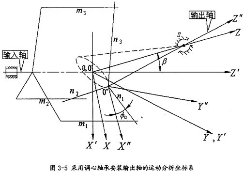 由于輸出軸作一圓錐運動,在分析的過程中需建立三套坐標(biāo)系,如圖3-5所示。