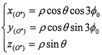 ≈o,cosθ≈1(實際上p<<L,近似處理是合理的),則可得到三小桿的球面中心P在固定坐標(biāo)系o′X′Y′Z′中的運動軌跡: