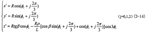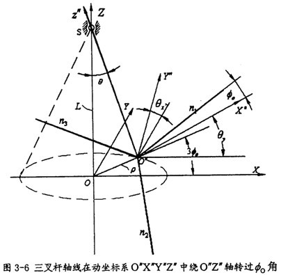 按圖3-5所示坐標(biāo)系,可先在動坐標(biāo)系O″X″Y″Z″中建立三叉桿軸頸的軸線參數(shù)方程然后通過坐標(biāo)變換轉(zhuǎn)至固定坐標(biāo)系O′X′Y′Z′中,因輸入軸的滑道軸線同三叉桿軸頸的軸線相交(于小桿球面的中心),故在坐標(biāo)系O′X′Y′Z′中聯(lián)立三叉桿軸頸的軸線參數(shù)方程和輸入軸的滑道軸線參數(shù)方程,在這個聯(lián)立的方程中會出現(xiàn)兩個未知量即輸出轉(zhuǎn)角
