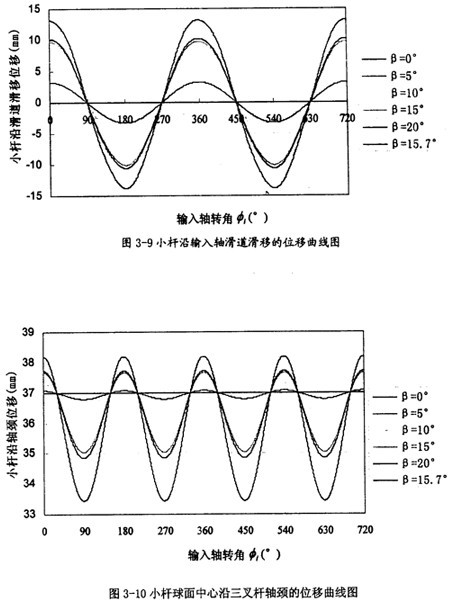 由曲線圖3-9可以看出,小桿沿滑道的位移隨兩軸夾角β的增大而增大,變化量也比較大,變化頻率為一個回轉(zhuǎn)周期1次。這可以作為三叉桿萬向聯(lián)軸器設(shè)計中,小桿長度的設(shè)計依據(jù)。