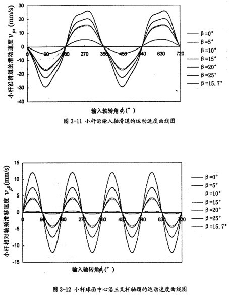 由曲線圖3-12可以看出,小桿球面中心P沿軸頸的線速度隨兩軸夾角β的增大其最大值增長也較快,它的變化頻率為一個回轉(zhuǎn)周期2次,曲線上下對稱這一數(shù)值可以作為動力分析中摩擦計算的重要依據(jù)。