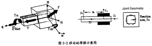 移動(dòng)副產(chǎn)生摩擦的示意圖如圖5-2所示。在這種運(yùn)動(dòng)副中只會(huì)產(chǎn)生逆向于移動(dòng)方向v(如圖5-2中藍(lán)色箭頭所示)的摩擦力Ffrict(如圖5-2中紅色箭頭所示),它的產(chǎn)生主要由三種因素,即構(gòu)件間相互作用的徑向力F、構(gòu)件間相互作用的扭矩Tn、構(gòu)件間相互作用的彎矩Tm(這三種力如圖5-2中綠色箭頭所示)。在施加由這些作用力產(chǎn)生的摩擦力時(shí),要考慮徑向力F的大小、等效作用臂長Rn(如圖5-2中右邊圖所示運(yùn)動(dòng)副間的重疊量和重疊量的變化情況、扭矩Tn的大小和它的等效反作用臂長Rn、彎矩Tm的大小和彎矩的反作用臂長XS(如圖5-2中間圖所示)。另外還得考慮靜摩擦系數(shù)、動(dòng)摩擦系數(shù)及預(yù)載荷的作用。