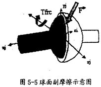 球面副產(chǎn)生摩擦的示意圖如圖5-5所示。在這種運(yùn)動(dòng)副中只會(huì)產(chǎn)生逆向于旋轉(zhuǎn)方向的摩擦扭矩Tfrc(如圖5-5中紅色箭頭所示),它的產(chǎn)生只有一種因素,即構(gòu)件間相互作用的徑向力F(如圖5-5中灰色箭頭所示)。在施加由相互作用的徑向力F產(chǎn)生的摩擦力時(shí),要考慮徑向力F的大小和球半徑,另外還得考慮靜摩擦系數(shù)、動(dòng)摩擦索數(shù)及預(yù)載荷的作用。