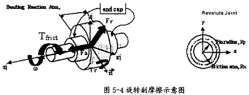 旋轉(zhuǎn)副產(chǎn)生摩擦的示意圖如圖5-4所示。在這種運(yùn)動(dòng)副中只會(huì)產(chǎn)生逆向于旋轉(zhuǎn)方向。(如圖5-4中藍(lán)色箭頭所示)的摩擦扭矩Tfrict(如圖5-4中紅色箭頭所示),它的產(chǎn)生主要由三種因素,即構(gòu)件間相互作用的徑向力Fr、構(gòu)件間相互作用的軸向力Fa、構(gòu)件間相互作用的彎矩Tr(這三種力如圖5-4中綠色箭頭所示)。在施加由這些作用力產(chǎn)生的摩擦力時(shí),要考慮徑向力Fr的大小、圓柱半徑RP(如圖5-4右圖所示)、軸向力Fa的大小、摩擦半徑Rn的大小(如圖5-4右圖所示)、彎矩Tm的大小和彎矩的反作用臂長(即旋轉(zhuǎn)副的長度,如圖5-4中左圖所示),另外還得考慮靜摩擦系、動(dòng)摩擦系數(shù)及預(yù)載荷的作用。