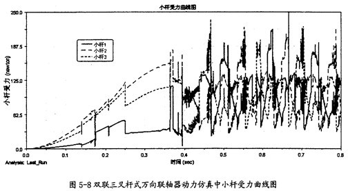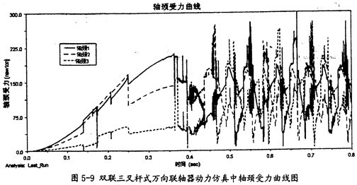 由圖5-9可以看出,雙聯(lián)三叉桿式萬向聯(lián)軸器在動(dòng)力仿真的過程中, 雙聯(lián)三叉桿一端的三軸頸同內(nèi)球頭的圓柱副上的作用力變化趨勢(shì)同圖5-8中的小桿變化趨勢(shì)是相同的。由于它們的受力變動(dòng)復(fù)雜,故這三力在雙聯(lián)三叉桿一端上的向量和也可能不為0。這樣在雙聯(lián)三叉桿上也會(huì)產(chǎn)生附加彎矩的作用。而且軸頸受力平均較小桿的受力要大。
