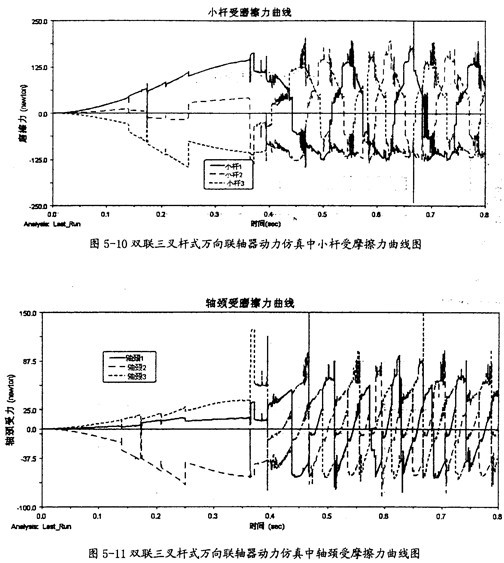 由圖5-10可以看出,雙聯(lián)三叉桿式萬向聯(lián)軸器在動(dòng)力仿真的過程中,其一端的三小桿同滑桿套軸間的摩擦力變化相當(dāng)有規(guī)律。當(dāng)小桿相對(duì)滑桿套軸運(yùn)動(dòng)反向時(shí),它們就會(huì)在正負(fù)間有規(guī)律的切換。