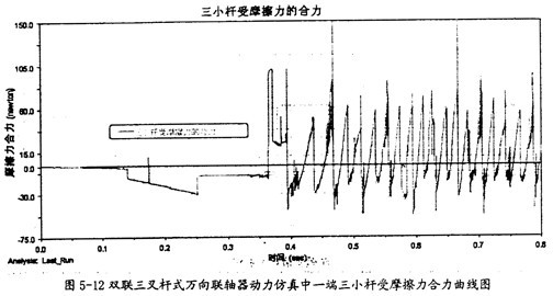 由圖5-11可以看出,雙取三叉桿式萬向聯(lián)軸器在動(dòng)力仿真的過程中,其一端的三內(nèi)球頭同軸頸間的摩擦力變化相當(dāng)有規(guī)律。當(dāng)內(nèi)球頭相對(duì)軸頸運(yùn)動(dòng)反向時(shí),綜們就會(huì)在正負(fù)間有規(guī)律的切換。但在這里產(chǎn)生摩擦力的平均大小要較小桿上的小得多。