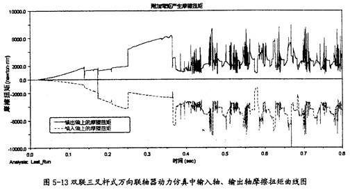 由圖5-12可以看出,雙聯(lián)三叉桿式萬向聯(lián)軸器在動(dòng)力仿真的過程中,其一端的三個(gè)小桿所受的摩擦力的合力變動(dòng)較有規(guī)律,其值在開始一段平滑,其后幾乎以0為中心波動(dòng)。由于這三個(gè)摩擦力的方向均平行于輸入軸或輸出軸軸線,故此合力會(huì)在輸入軸和軸出軸上產(chǎn)生軸向的力,在輸入軸和輸出軸上產(chǎn)生摩擦扭矩。如取其水平較高值60牛來計(jì)算,它產(chǎn)生的摩擦扭矩為270N·mm(60×0.3×15=270,其中0.3為動(dòng)摩擦系數(shù),15為摩擦半徑),此值相對(duì)圖5-13中的值而方相當(dāng)小。