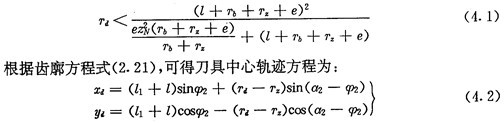由上面可知,用數(shù)控加工齒廓時(shí),應(yīng)求出圓插刀中心的軌跡,它是被加工內(nèi)齒圈齒廓曲線的內(nèi)法向等距線,如圖4.3所示。圓插刀的半徑可不等于實(shí)際推桿減速器中滾子的半徑,只要刀具半徑Td小于內(nèi)齒圈齒廓在齒根部的最小曲率半徑,在加工過程中不會(huì)發(fā)生切削干涉即可。對(duì)于激波器為偏心圓的推桿減速器,根據(jù)(2. 35)式,可得不發(fā)生切削干涉的條件為: